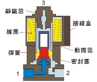 當電磁閥線圈斷電時,接口2與接口1關閉,1通向3;